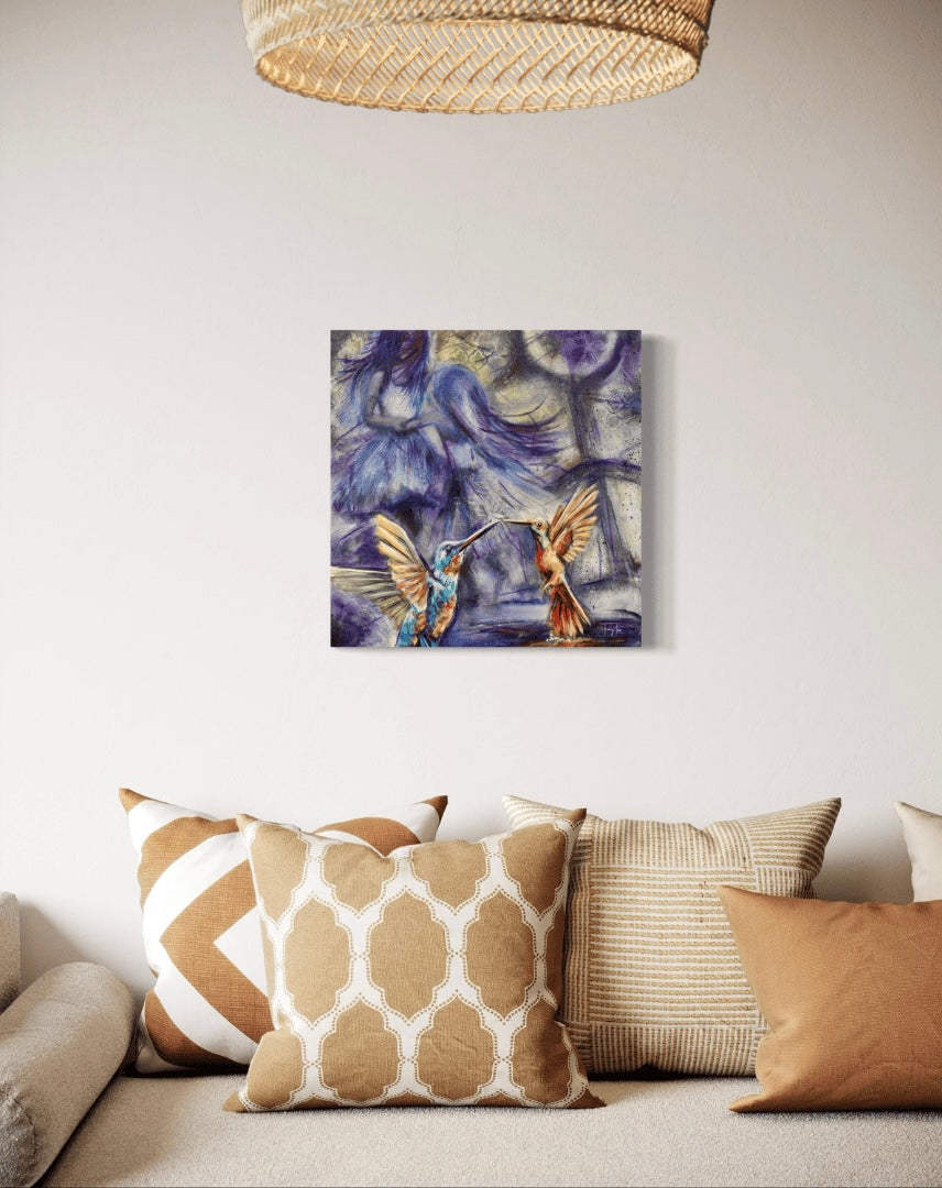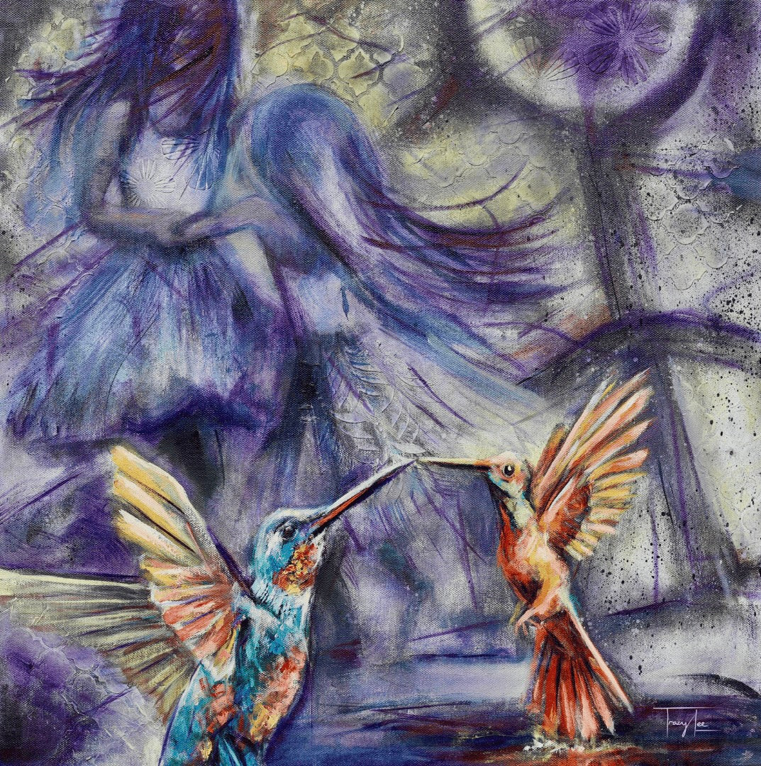 "Boundless Horizons" by Tracy Lee Warusevitane - embodies the spirit of limitless possibility and joyful exploration. Two young sisters play together, their laughter filling the air, while two vibrant hummingbirds soar ahead, symbolising freedom and the thrill of discovery. This painting invites us to embrace the wonder of life's journey, reminding us that the world is vast, and every adventure offers endless opportunities to grow, explore, and dream.