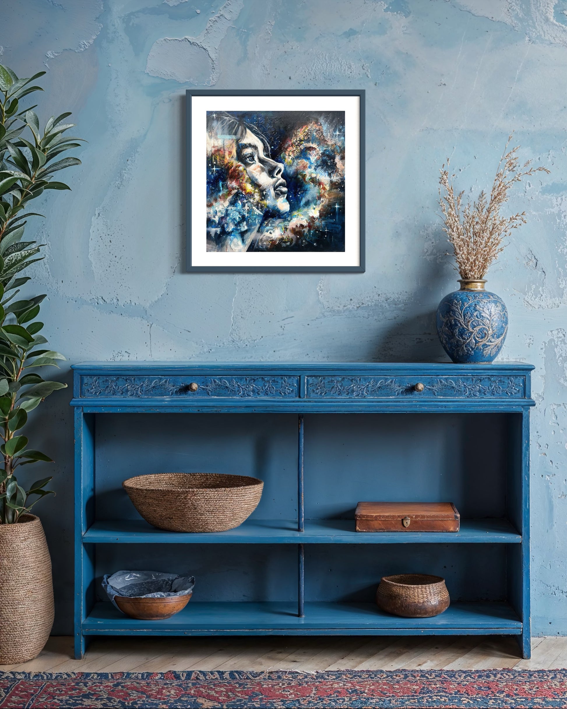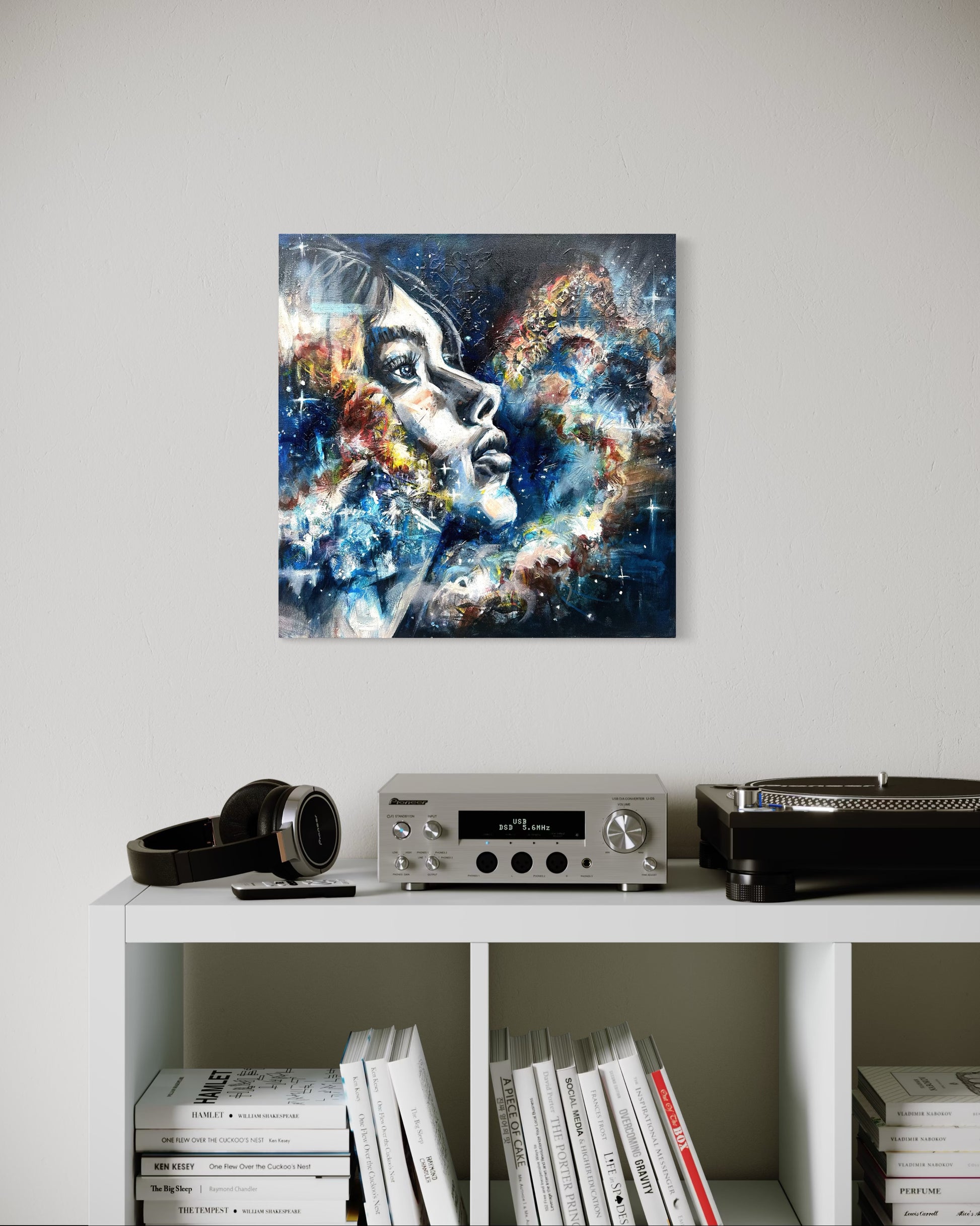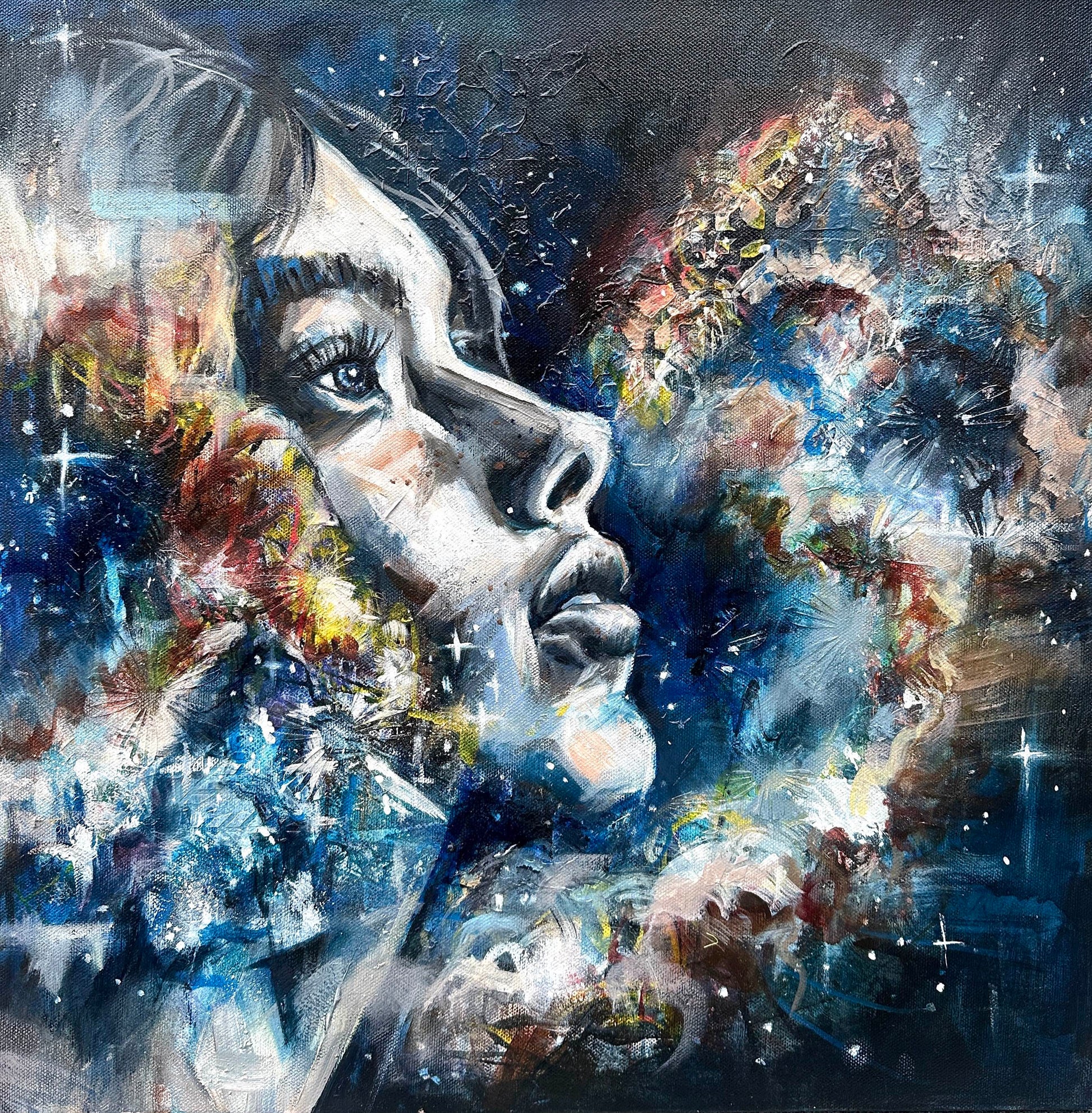 Visually, Cosmic Dreamer brings harmony—whites, blacks, blues and browns in the nebula offer calm, while vibrant bursts and stars spark curiosity and conversation. Layers of charcoal, inks, spray paint, modelling paste, acrylics, and rich oils create a textured surface full of depth and complexity. The edges are painted on quality gallery wrapped canvas, the surface varnished, and it is ready to hang.