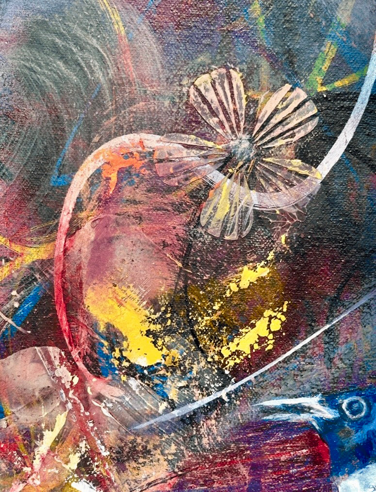 Mixed media finished in oils on gallery wrapped canvas.