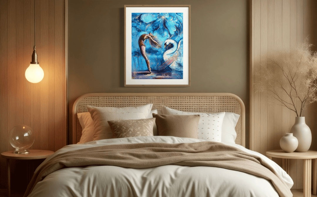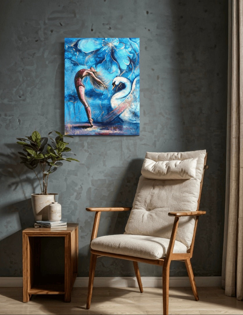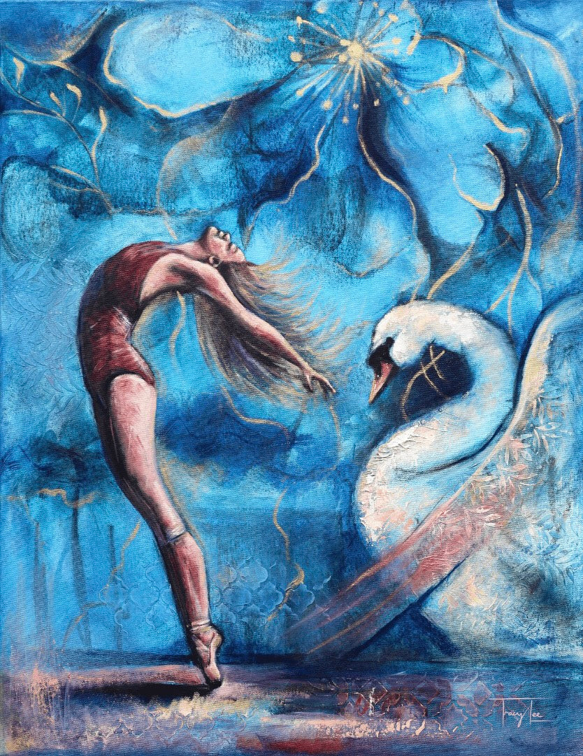 "Graceful Exploration" reveals the transformative power of movement and nature. A swan glides with regal poise alongside a dancer, their shared elegance a symbol of strength and fluidity. Surrounded by vibrant blue flowers and radiant gold, this painting invites us to embrace transformation—discovering beauty, balance, and limitless possibility within ourselves.