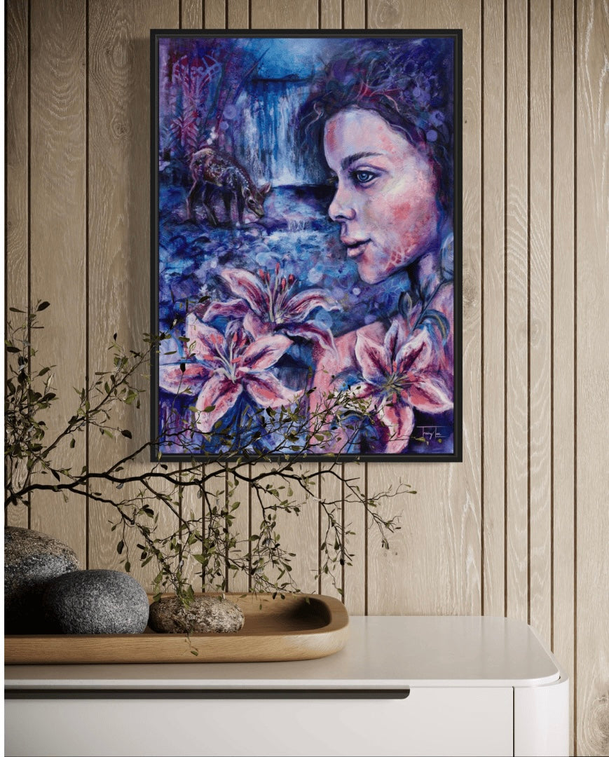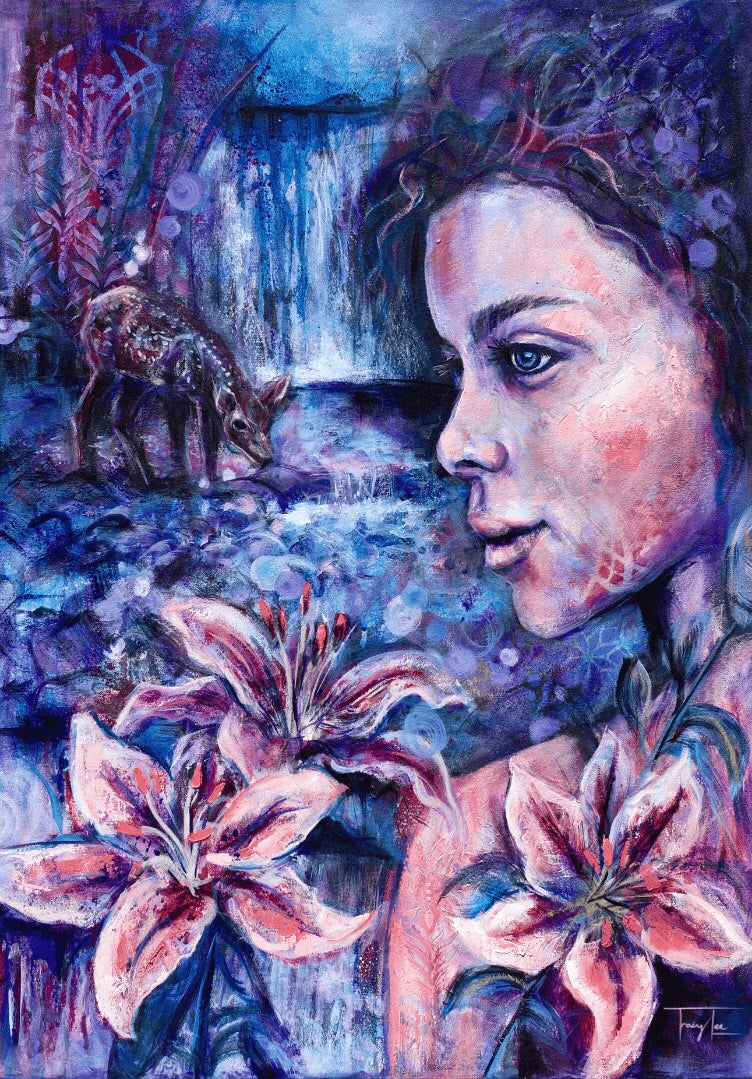 "New Chapter" by Tracy Lee Warusevitane - embodies the beginning of a transformative journey. A graceful deer stands at the edge of a cascading waterfall, while a woman, poised and serene, gazes into the horizon. Surrounded by delicate lilies, the scene captures a moment of renewal and connection with nature, inviting the viewer to step into a fresh beginning, where strength, beauty, and possibility converge.