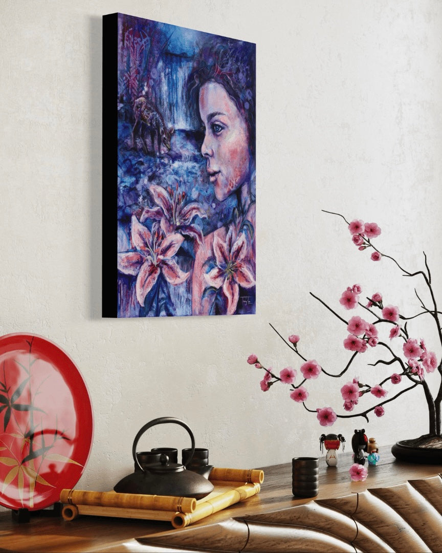 In my life, I’ve often found myself beginning again—by choice or by chance—carving fresh paths, chasing new dreams, letting go of what no longer fits. This painting holds the symbols of that spirit: a waterfall rushing forward, never looking back; lilies rising pure and bright from still water, untouched by what lies beneath; and a lone deer standing at the edge of the scene, poised between what was and what’s to come.