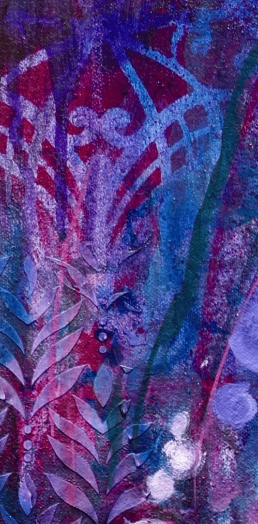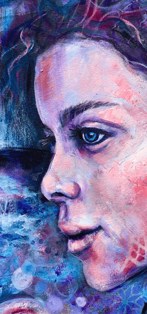 This original mixed media piece blends inks, spray paint, acrylic, modelling paste, and powdered pigments, finished with high-quality oils. Painted on a gallery-wrapped canvas with finished edges, it is varnished and ready to hang or be framed to suit your space.