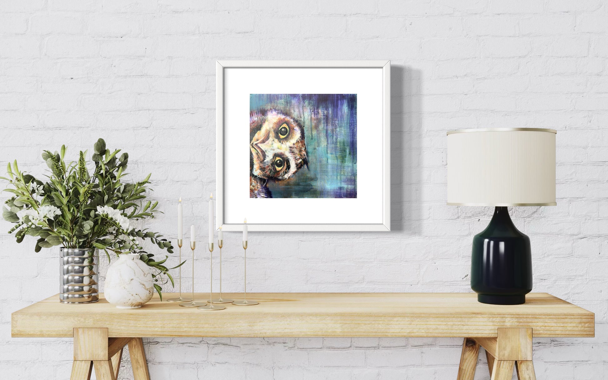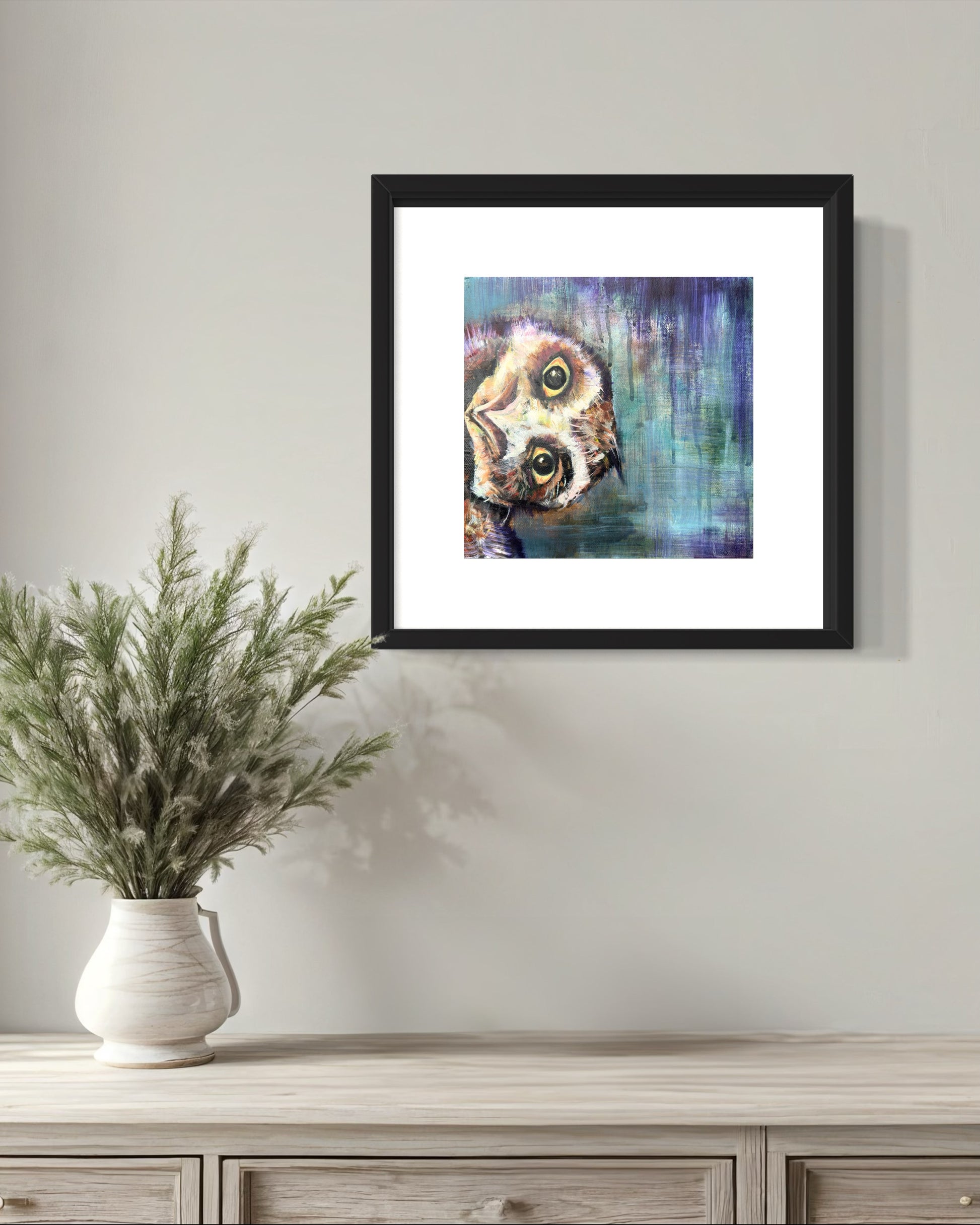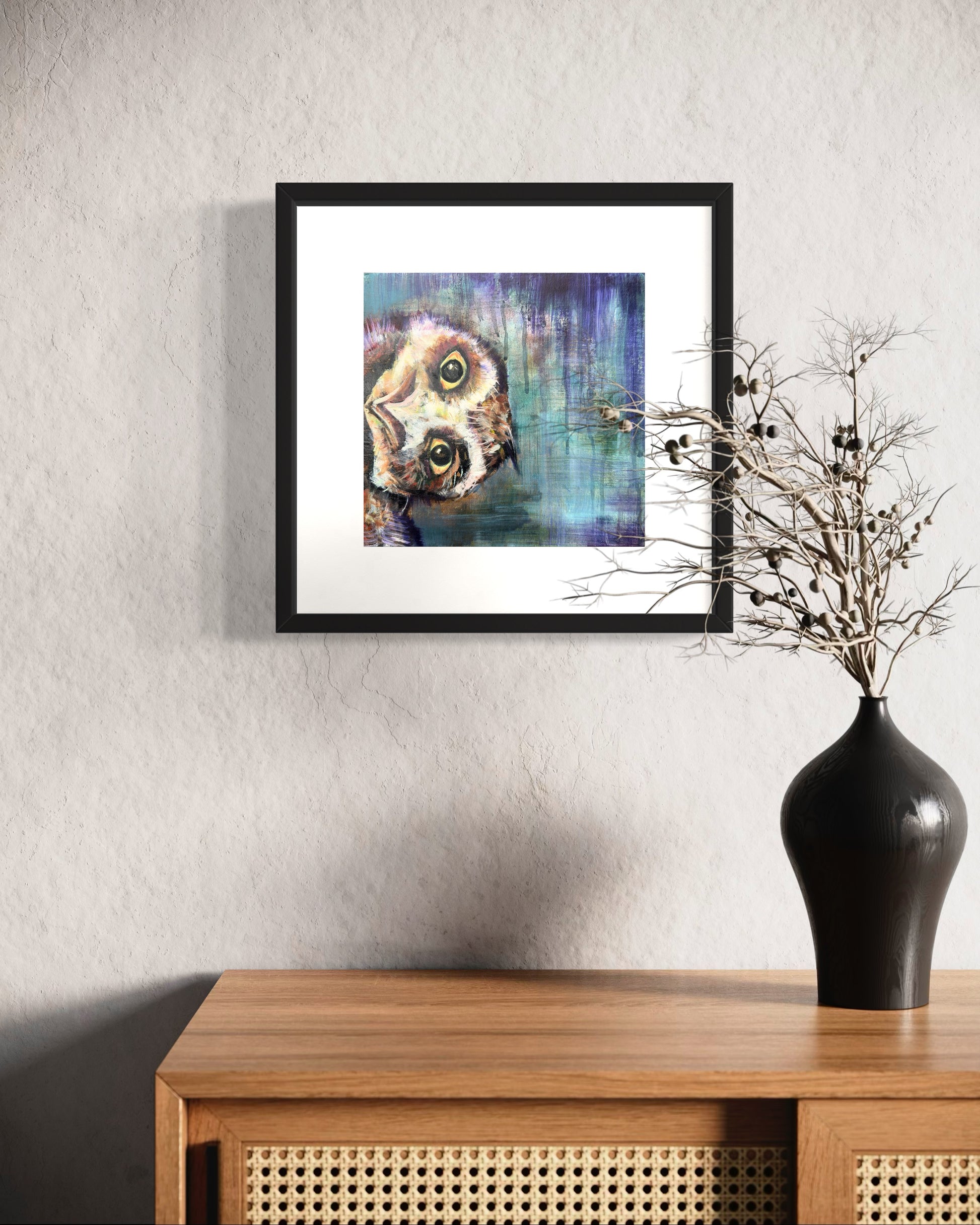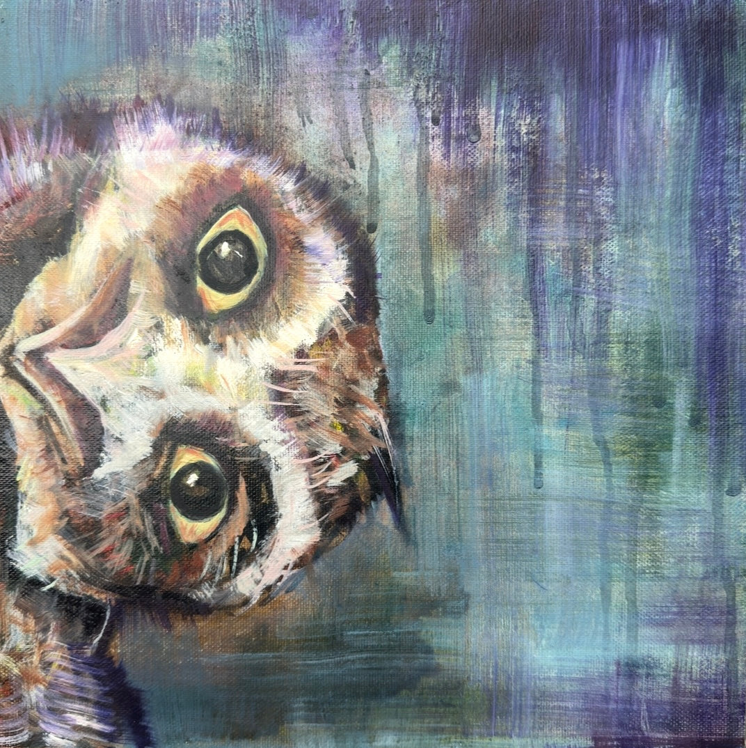 Playful, curious, and a little bit mischievous, “Night Shift Shenanigans” invites viewers into the whimsical world of a nocturnal observer caught mid-antics. With a tilted gaze and richly textured background, this piece blurs the line between dream and waking life—where the quiet of night becomes a stage for unexpected delight.