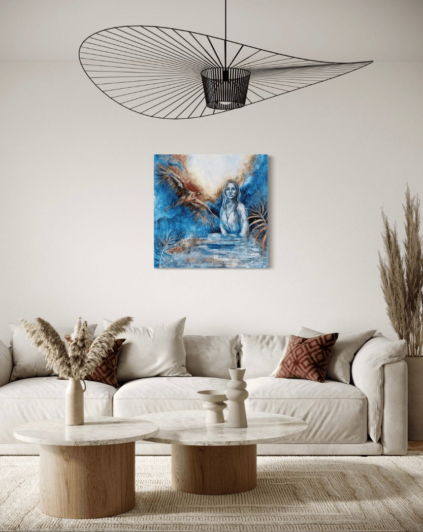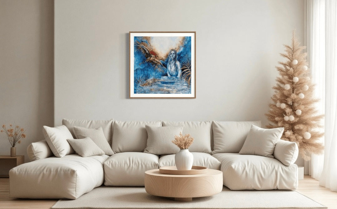 "Spirit of the Journey" captures the essence of fearless exploration. A woman, gazing into the distance alongside a soaring eagle, embodies the relentless drive to seek new horizons. This painting inspires us to embrace the unknown with courage and vision, reminding us that the journey itself is where true growth and discovery lie.