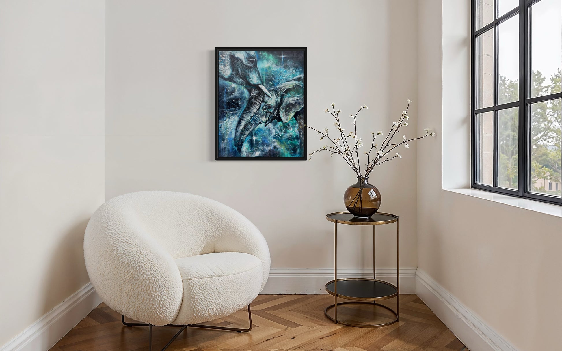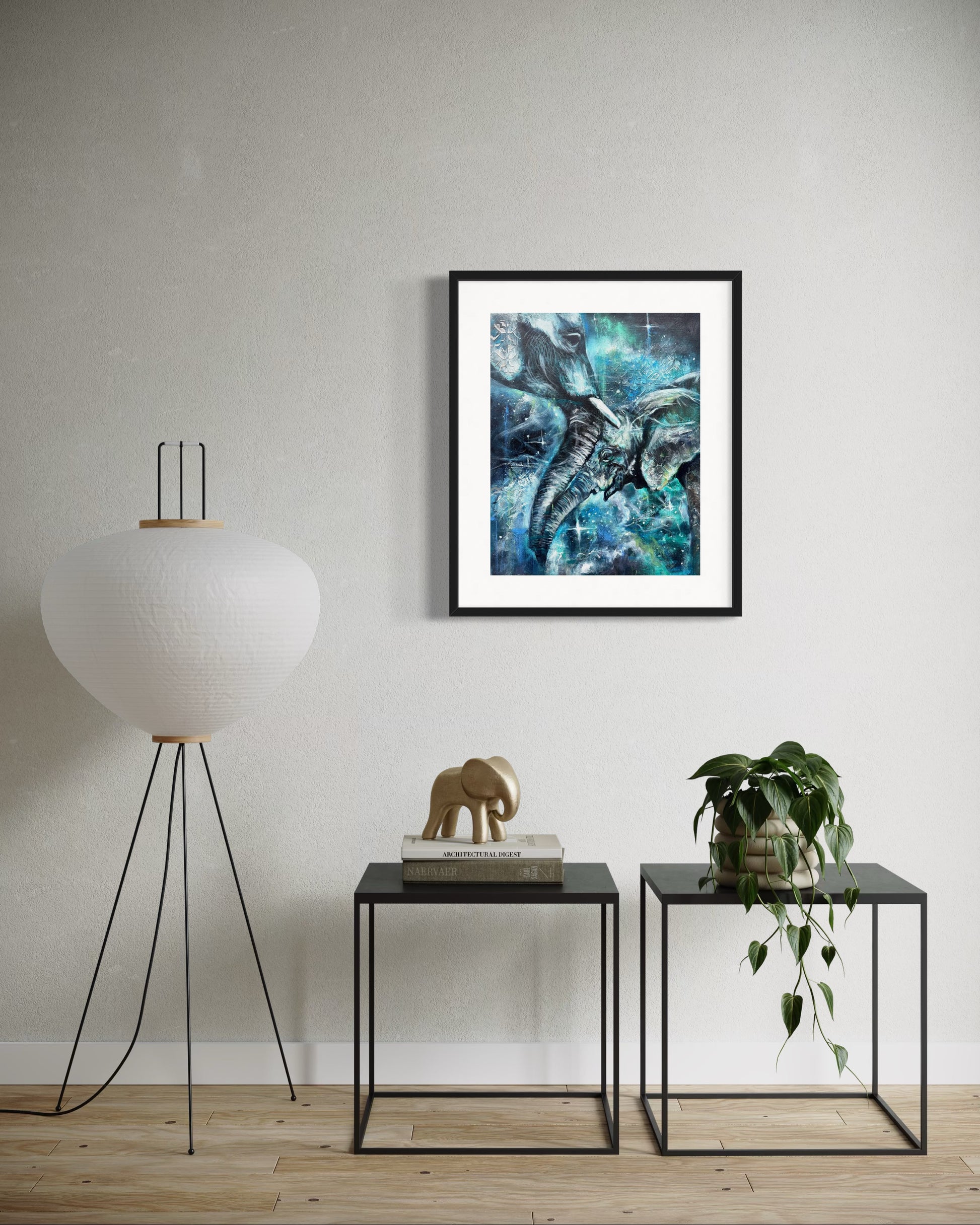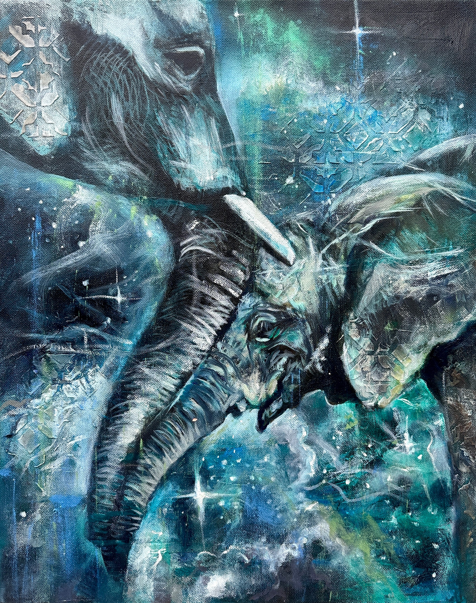 “Guardians of the Blue Dot” by Tracy Lee Warusevitane – In this cosmic portrait, the elephant embodies wisdom, memory, and deep connection — a gentle giant protecting life’s fragility. Beneath the stars, elder and young share a moment that echoes across generations, reminding us that even on this tiny “lucky speck” in the universe, love and protection give life its meaning.