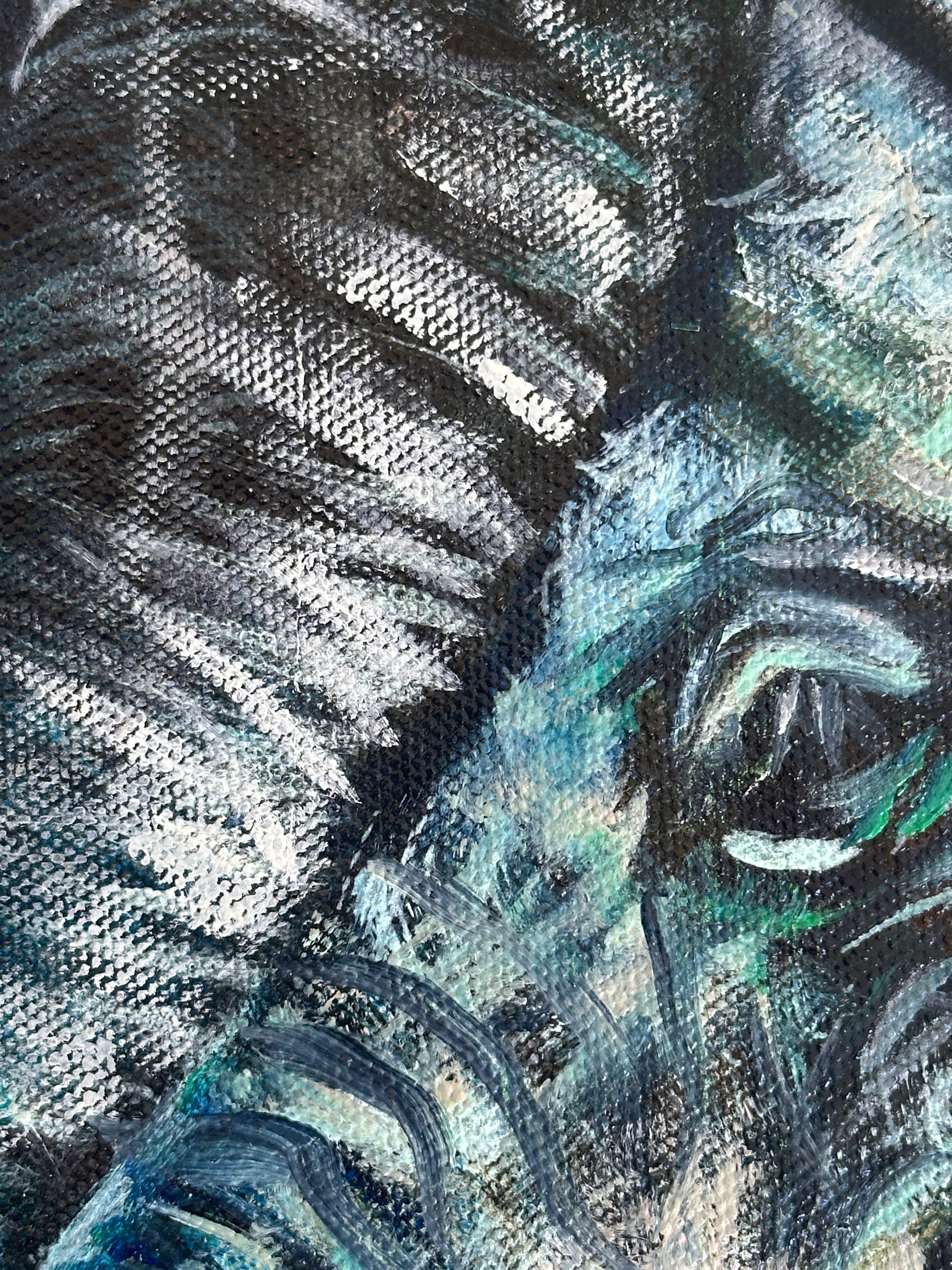 Visually, Guardians of the Blue Dot brings harmony and intrigue—whites, blacks, blues and greens in the nebula offer calm, while vibrant bursts and stars spark curiosity and conversation. Layers of charcoal, inks, spray paint, modelling paste, acrylics, and rich oils create a textured surface full of depth and complexity. The edges are painted on quality, gallery-wrapped canvas, the surface varnished, and it is ready to hang.