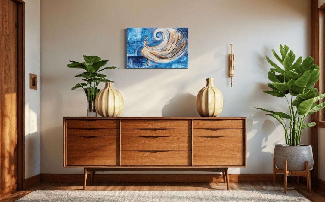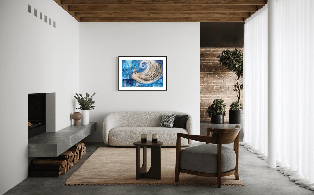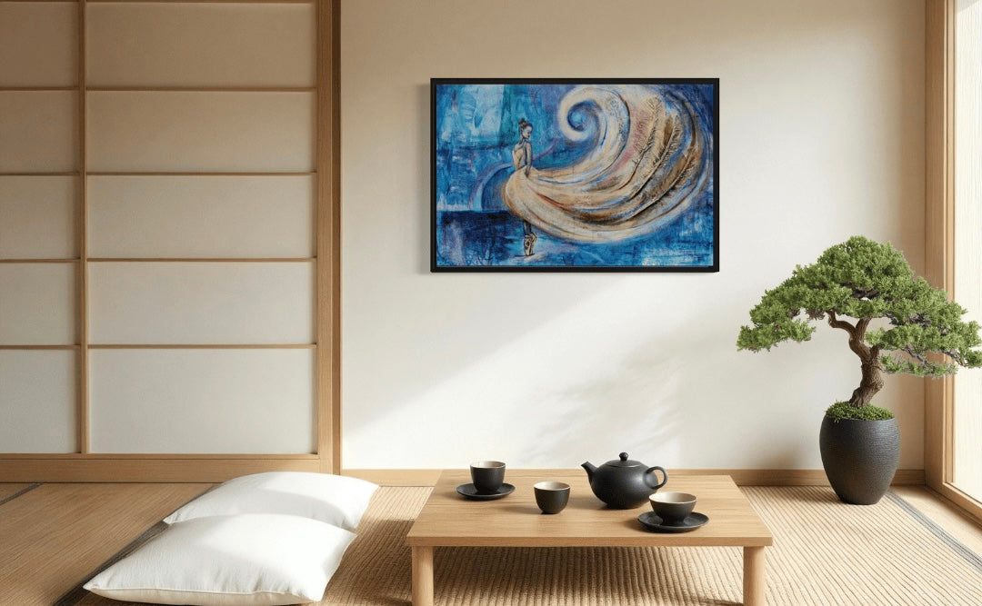 "Whirlwind of Elegance" captures the spirit of fearless exploration and transformation. A ballet dancer, adorned with feathers like a peahen, spirals into the unknown, her movement symbolizing the endless journey of discovery and growth. This painting inspires us to embrace change with grace, trusting that every turn leads us closer to our true path.