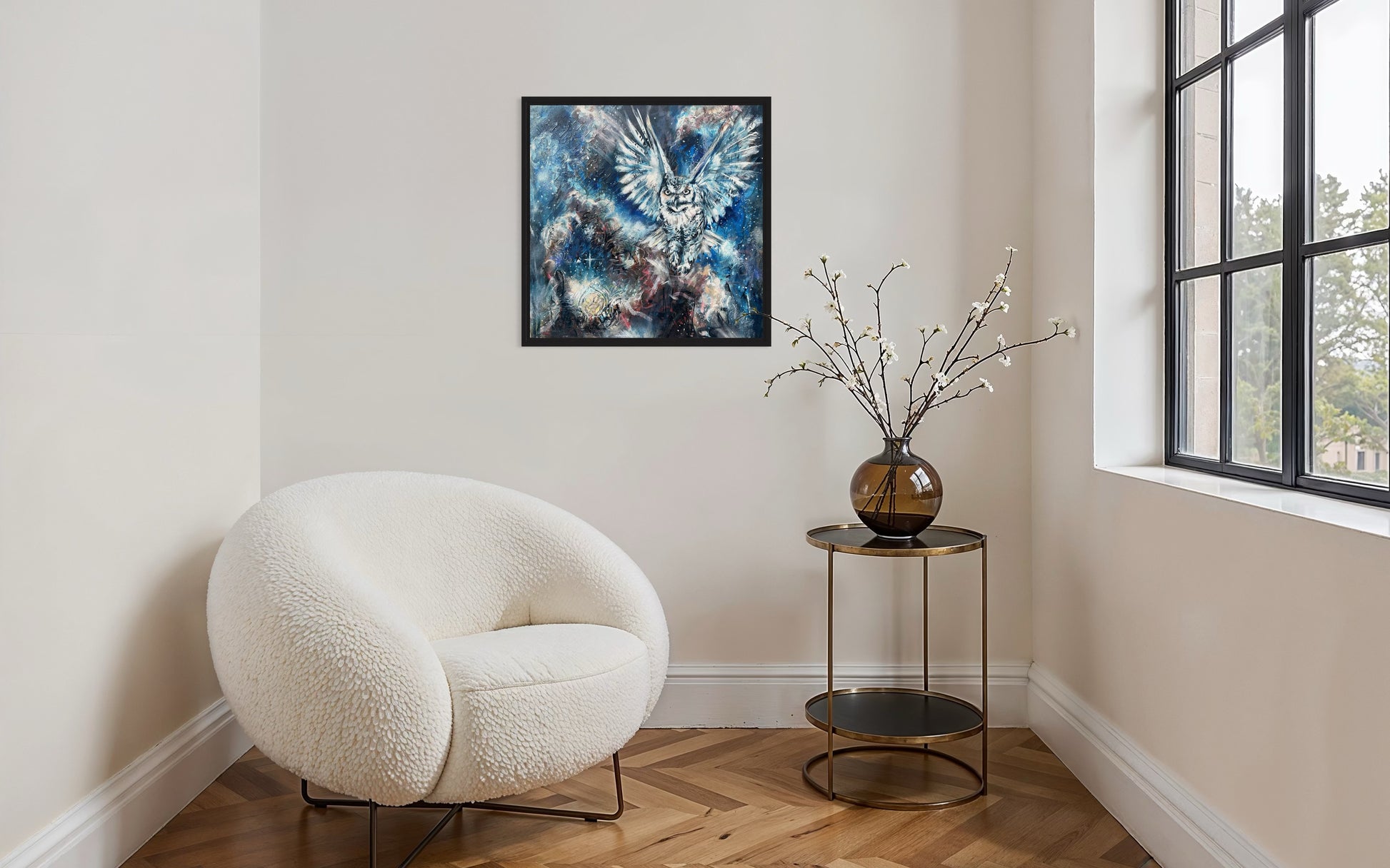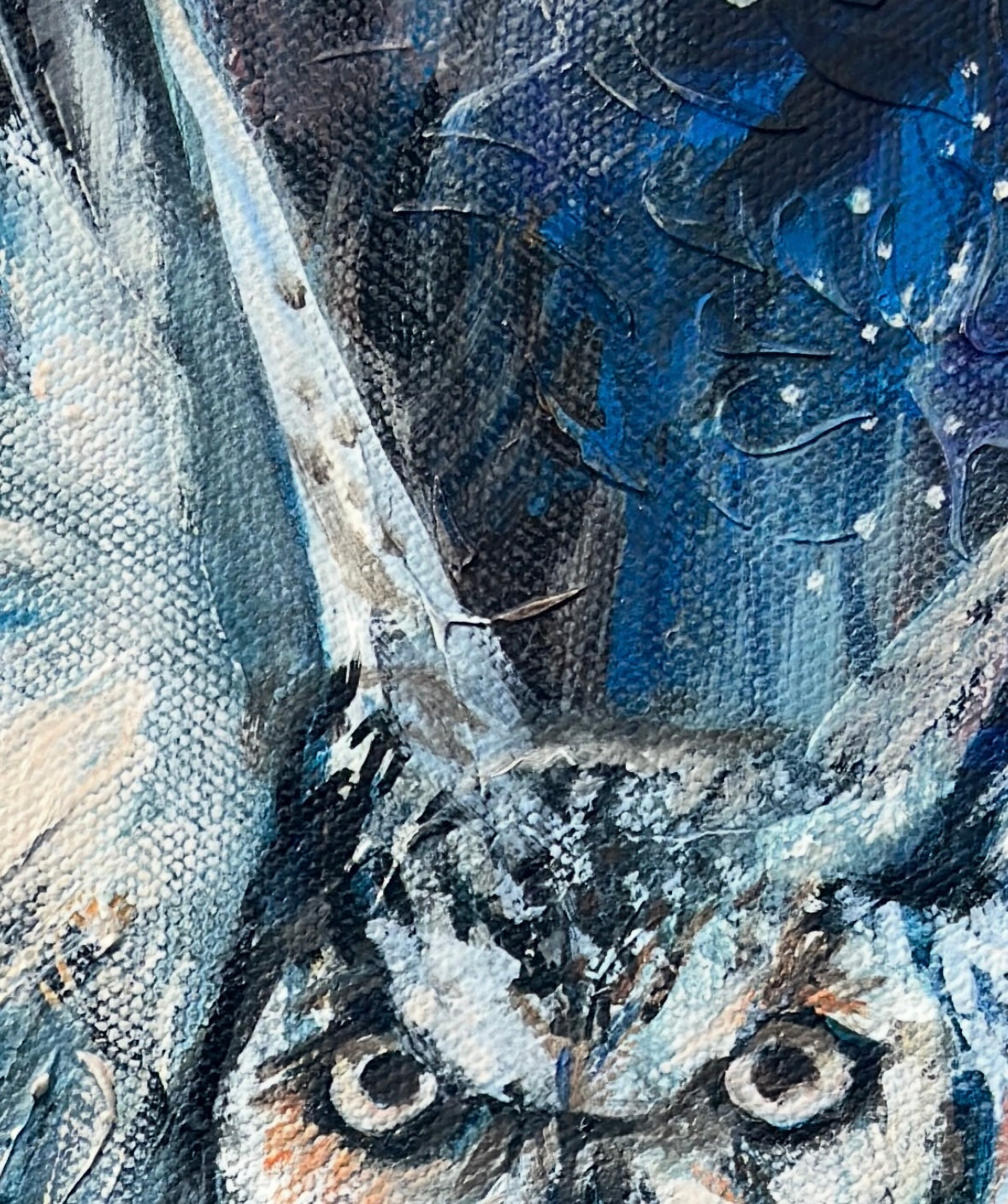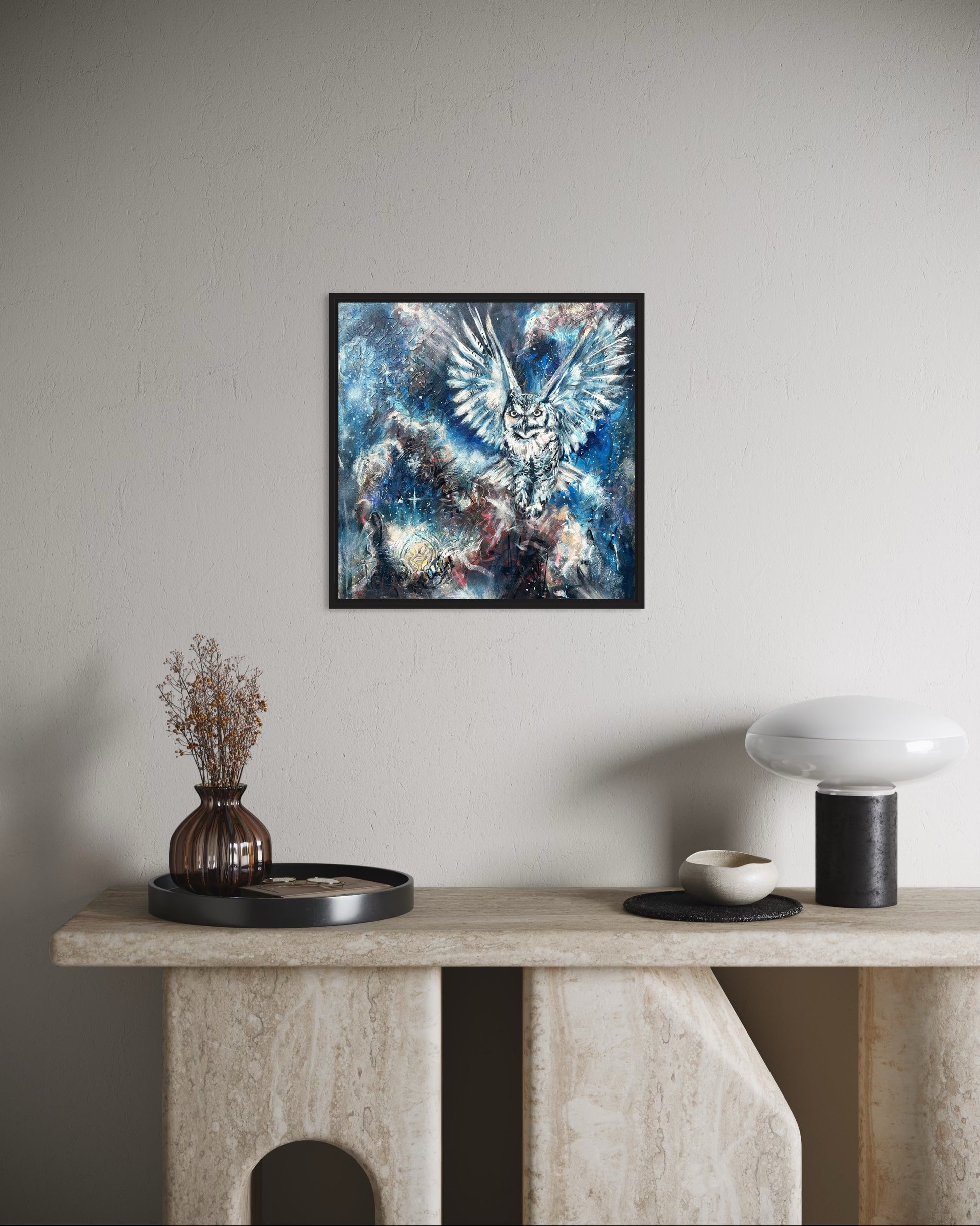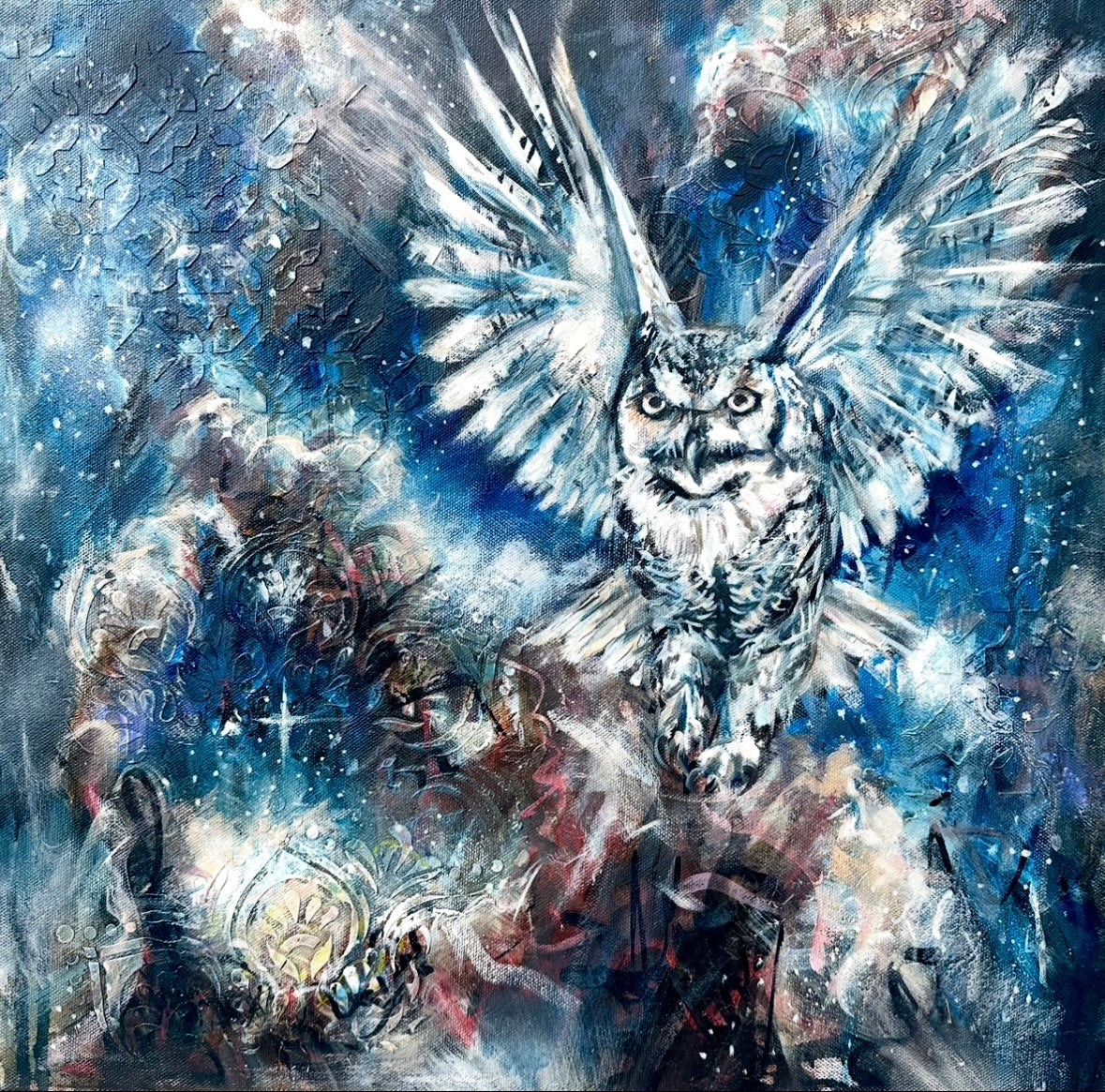 Visually, Whispers from the Blue Dot brings harmony—whites, blues and browns in the nebula offer calm while vibrant bursts spark curiosity and conversation. Layers of charcoal, inks, spray paint, modelling paste, acrylics, and rich oils create a textured surface full of depth and complexity. The edges are painted on quality, gallery-wrapped canvas, the surface varnished, and it is ready to hang.