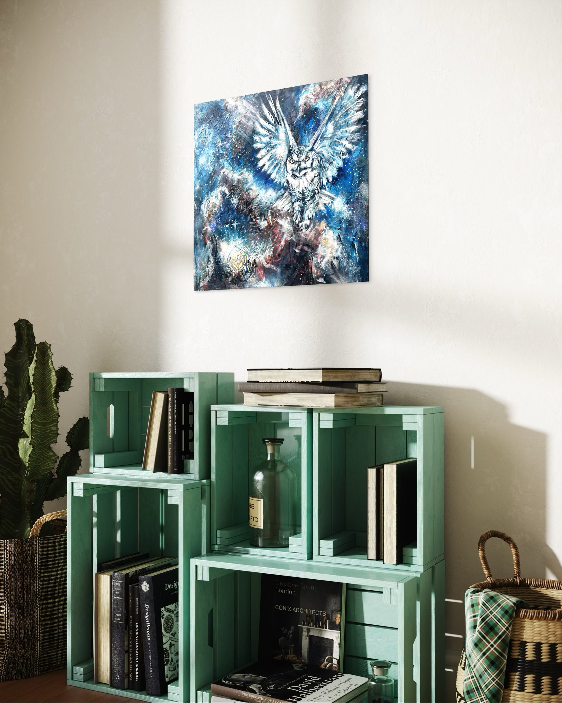 “Whispers from the Blue Dot” by Tracy Lee Warusevitane – An owl soars through a swirling cosmos, carrying ancient wisdom across the stars. It speaks not of answers, but of perspective—reminding us that on this tiny blue dot, we are fleeting, free, and full of potential. In the vastness of the universe, what matters most is how we choose to live, love, and explore.