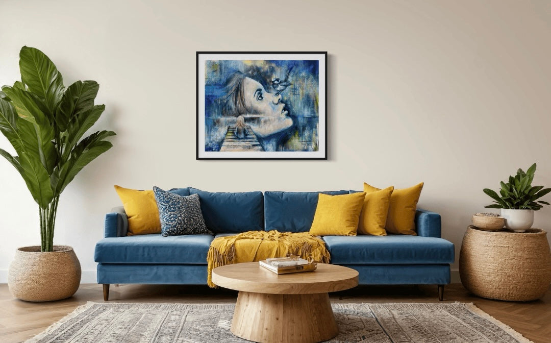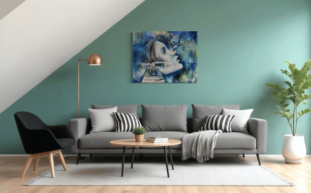 "Whispers of Possibility" captures the delicate tension between uncertainty and potential. A girl with a bird perched gently on her nose embodies the quiet wonder of unexpected moments, while another girl gazes into the distance from a dock, contemplating the endless possibilities ahead. This painting invites viewers to embrace the unknown with curiosity, reminding us that every fleeting moment holds the promise of new paths, new discoveries, and new beginnings.